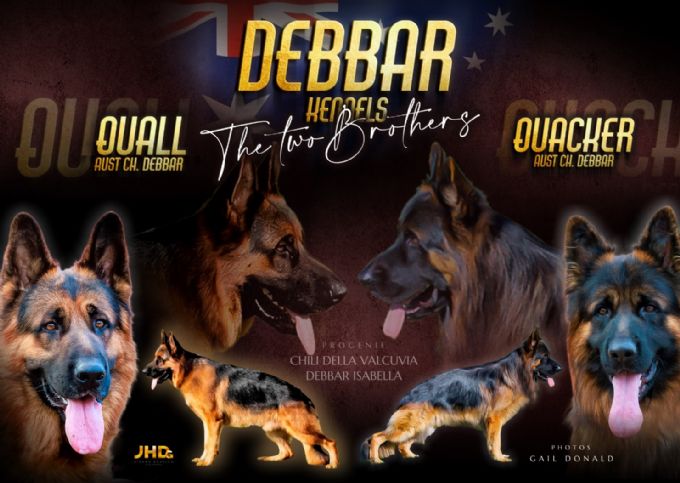 Home Of The Brothers (Sc ) Ch. Debbar Quall AZ Bscl Multi Excellent Graded Excellent Merit QLD State Breed Show 2024 (Lsc) Ch. Debbar Quacker AZ Bscl Multi Excellent Graded Excellent 1st Open Dog QLD State Breed Show 2024 Home of Aust Champion Debbar Porsche 'A"Z' BSCL1 Multi Excellent Merit Best Bitch In Qld Three years In a Row sadly lost Porsche on the 06/08/2013 and will be sadly missed never forgotten And her beautiful G G grandsons Litter Brothers Quacker and Quall doing her proud... Let me Introduce myself I have been a member of the Canine Control Council Qld, & German Shepherd Dog Club of Qld since 1993 My first dog was mozart who was was excellent at obedience But we all have to start somewhere,since then I bought my Foundation Bitch Tiffany From Astasia Kennels. I have gone though all Schemes with the club making sure I get all dogs hips and elbows exrayed and pass. also breed surveyed which consists of the conformation of the dog and gun and crowd tested Also now all my dogs are DNA Tested. I have done Obedience with some of my dogs and with the help of Norma Deacon who Has got the Obedience titles on two of my dogs. My First litter was 1999 For the short time I have been breeding I feel I have done very well. For our Qld National in 2005 I Had 4 Dogs on the Pegs, At that national I got Presented with a Bronze medal From National Council For ten Dogs Passing with AZ Stamps,which means they have passed with there hips and elbows. Then in 2009 Qld national I got presented with silver medal which is 25 dogs passed with there hips and elbows. I now have my gold Medal Presented at our July Champ show Qld 2019. Which I'm very proud of. In the Breed survey scheme I have 47 Breed Survey Classified I have also Bred 30 Australian Champions. One neuter champion Debbar more wishes owner Ms G Perkins one CDX ET Abba owned by myself and Trained and handled by Mrs N Deacon. And one U D TDX by Debbar Grande who is owned and trained by Mr T E Telford and Mrs C G Pethers. and Three CD Titled And now bred a beautiful bitch Aust Ch. Debbar Porsche 'A"Z'won Intermediate Bitch Class at Qld National 2009 Qld State breed 2010 Siegerin