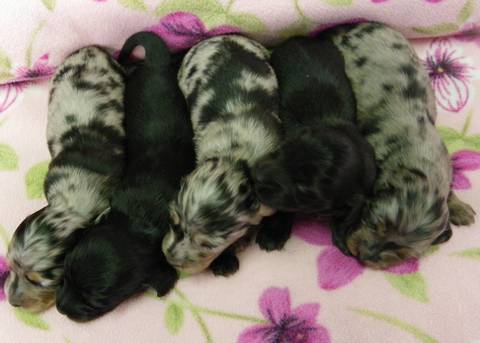 Litter of 5 pups born on the 11th October.  Pups will be ready to go to new homes after 11th December.  There are 2 red females available in this litter.