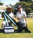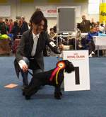Robin seen here with Kate McMillan his breeder(Minuteman Minis of Canada) showing in Australia. Robin taking one of his multiple In Show and Runner-Up Best in Show awards(judge Mrs G Lesh, terrier breed specialist)